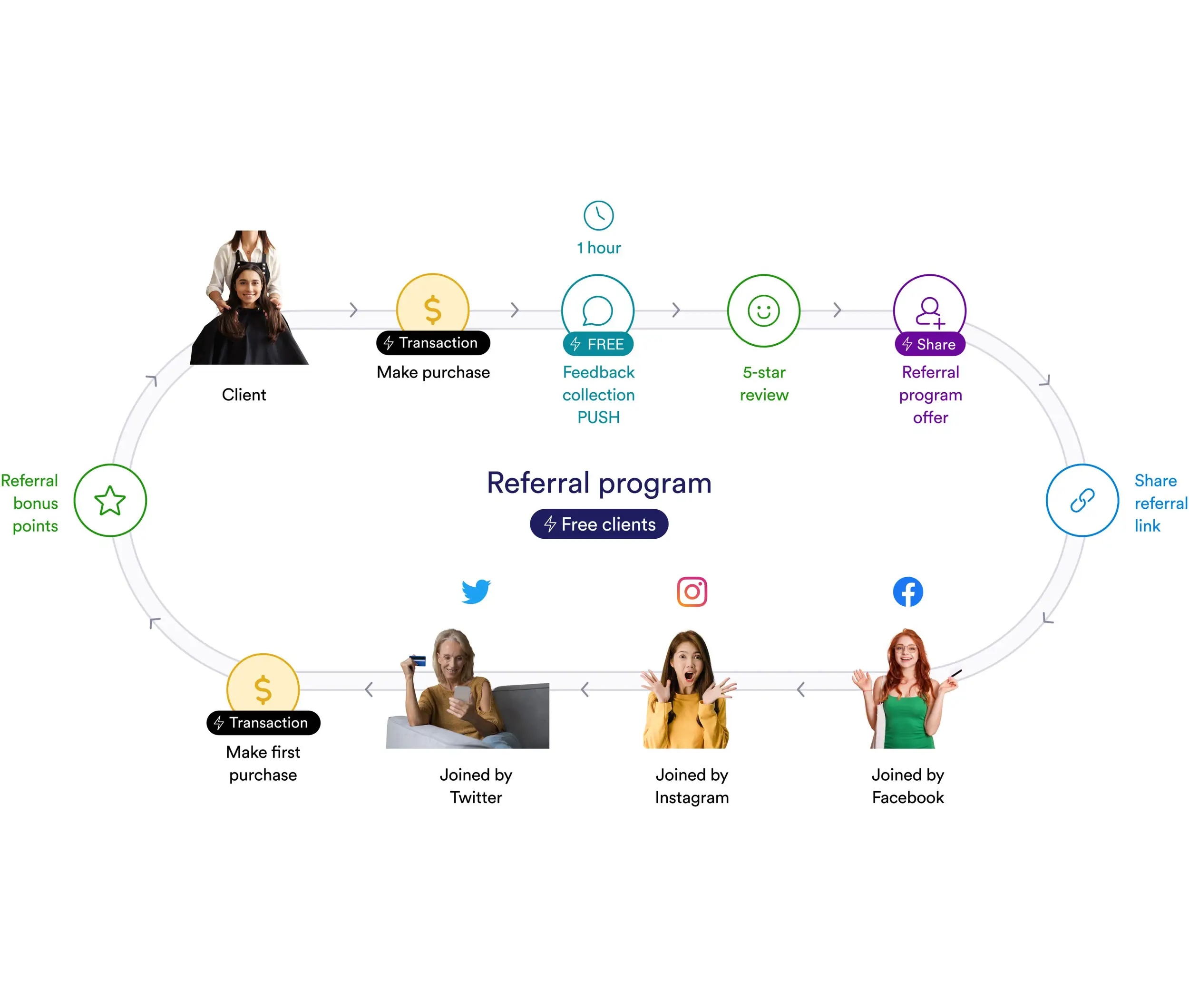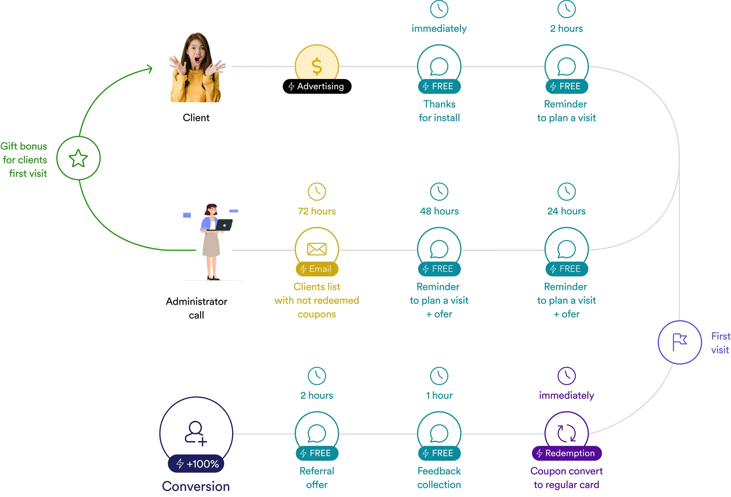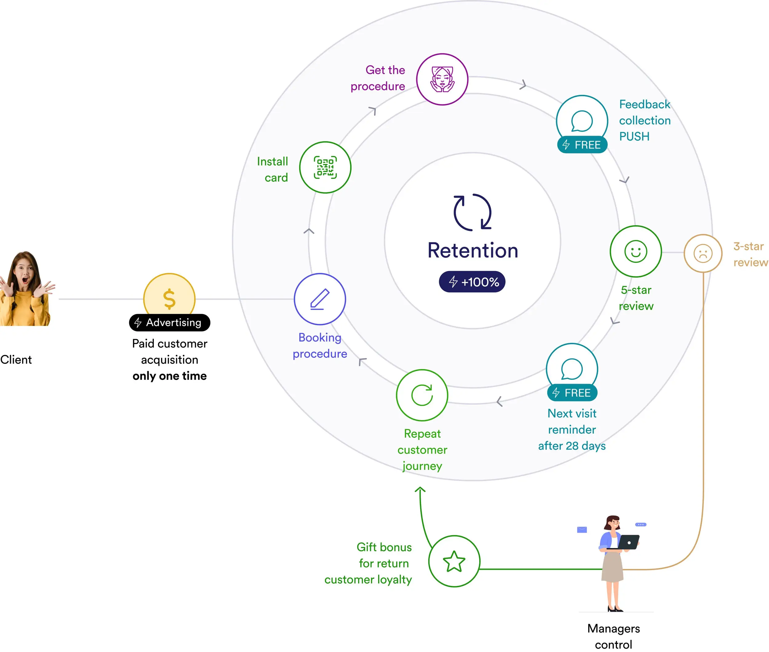 Automatic PUSH comes 1 hour after purchase. Client is invited to leave feedback on the service quality.